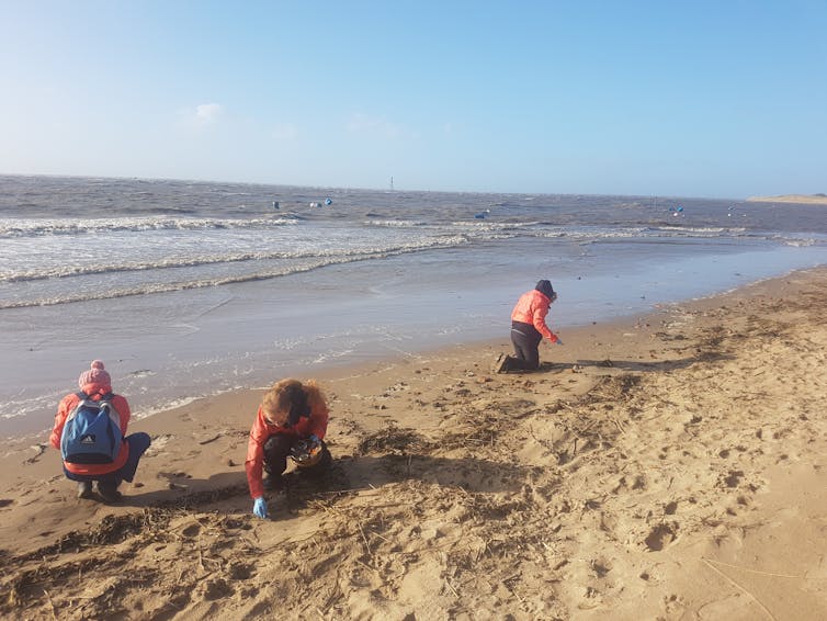 Volunteers survey the beach for nurdles. Claire GwinnettAuthor provided